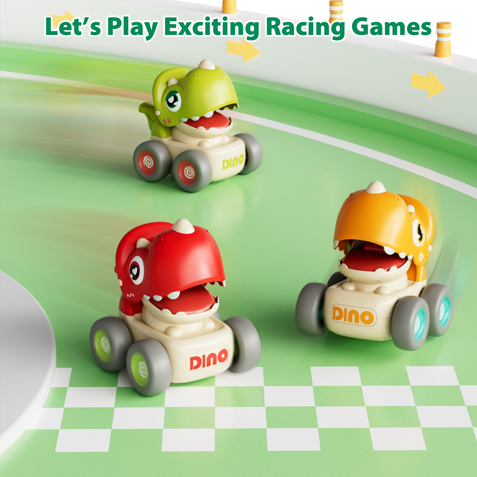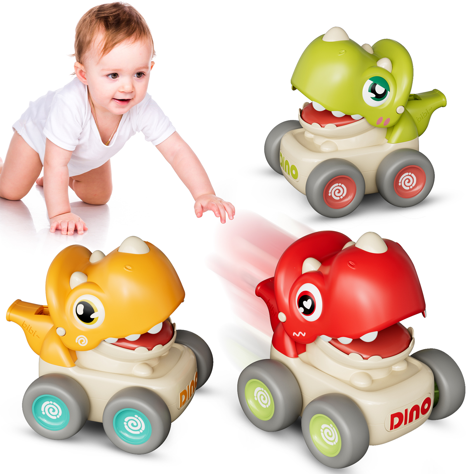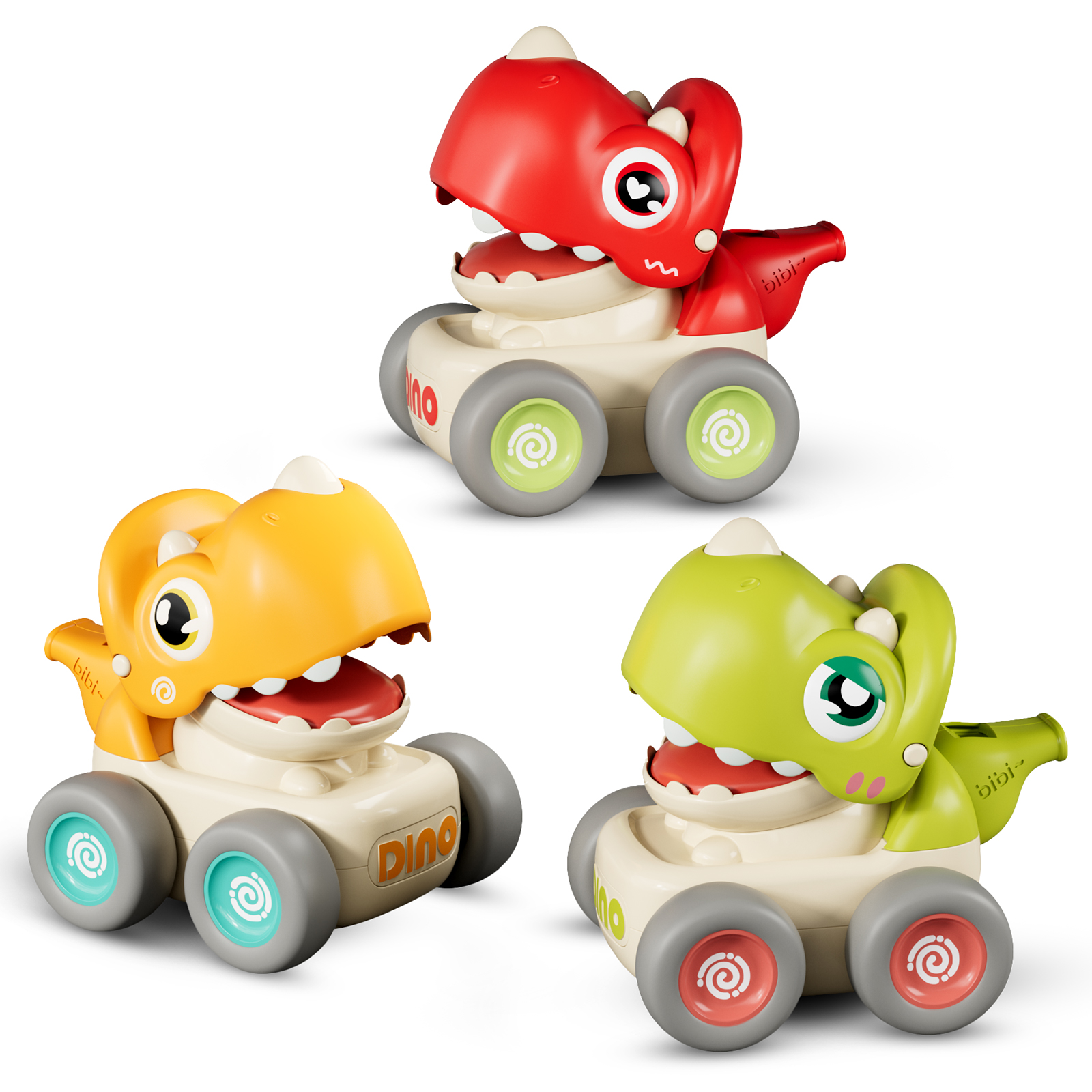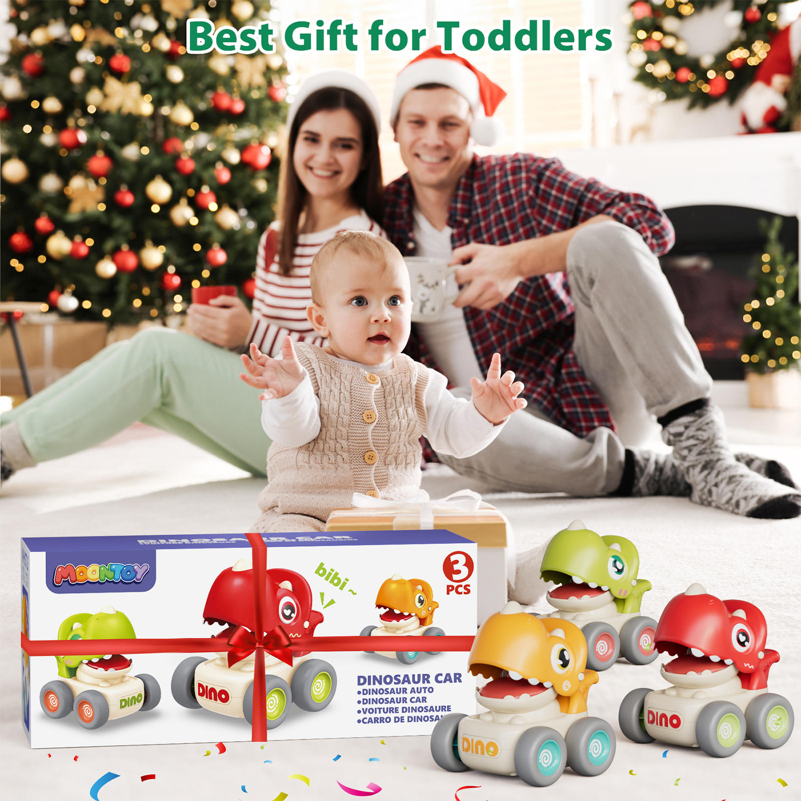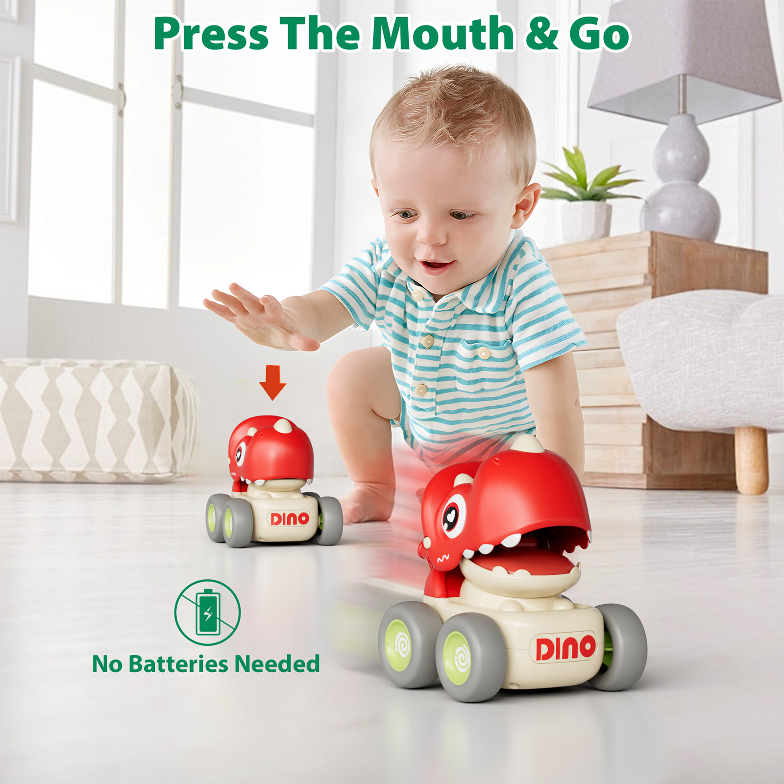 Press and go fun: No batteries needed, the cute car will start driving by pressing the mouth of the dinosaur car toys, easy and fun for toddlers. Equipped with non-slip wear-resistant wheels, strong grip. Far and stable driving, the kids could race the cars indoors or outdoors. Ideal toys for 1 2 3 year old boys girls.